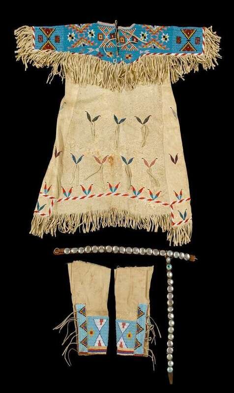 The fringed yoke beaded in lane stitch with polychrome geometric devices on a blue ground, the skirt beaded with striped leaves and hide fringe; together with a pair of beaded child's leggings and a child's leather and German silver concho belt.