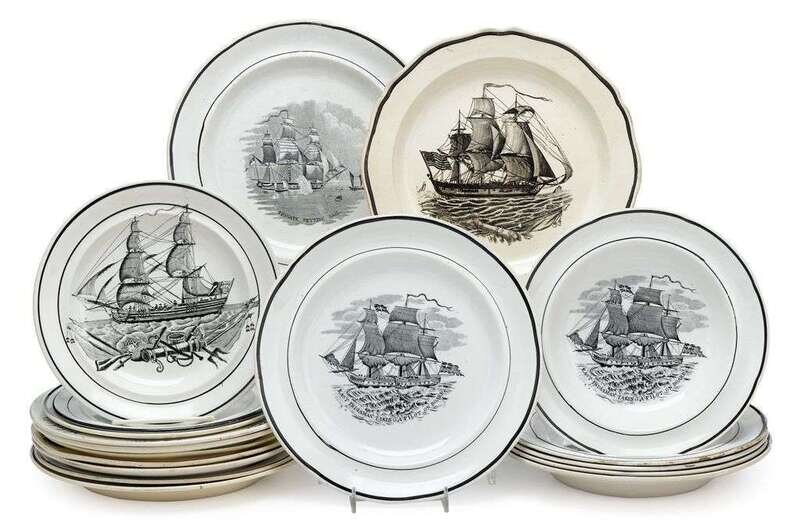 Including soup plates and dinner plates, most depicting British ships, including "East Indianman taking a pilot on board" and "Frigate Setting Sail", three decorated in polychrome.