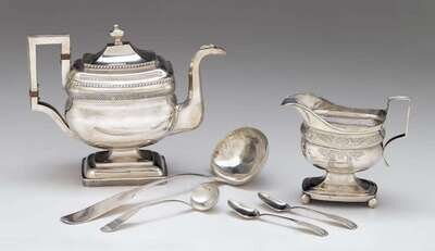 Of oblong form with bright-cut engraved floral and swag shoulder band, the body with engraved swags and cartouche, continuing to rectangular base, all raised on four ball feet; together with two teaspoons with shell terminuses, all monogrammed.