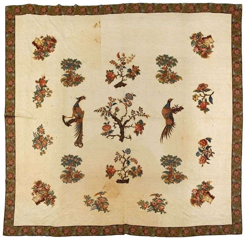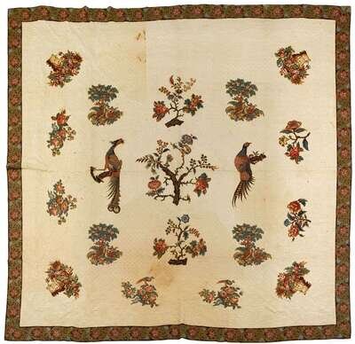 Worked with a wide flower and scroll printed border enclosing appliqued chintz birds, trees and baskets of flowers, heightened with grape and flower vine, feather, basket of flowers and conforming quilting.