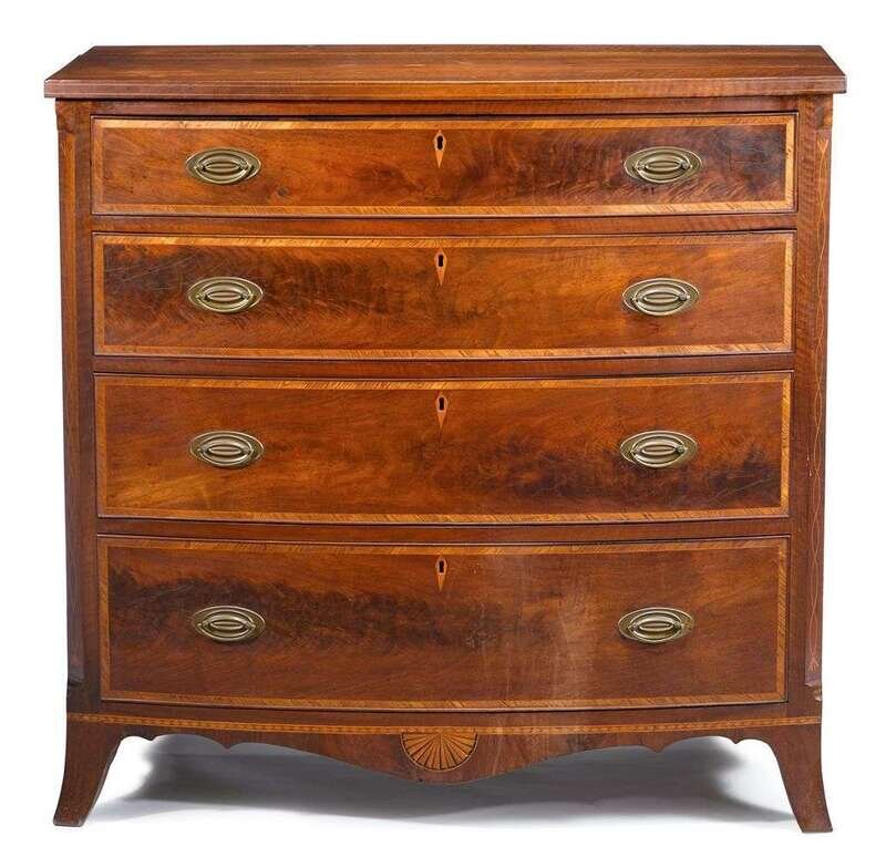 Bow front with graduated banded drawers having barber pole inlaid borders, chamfered corners inlaid with intertwined vine and fan, the shaped apron centering an inlaid fan, on French bracket feet.