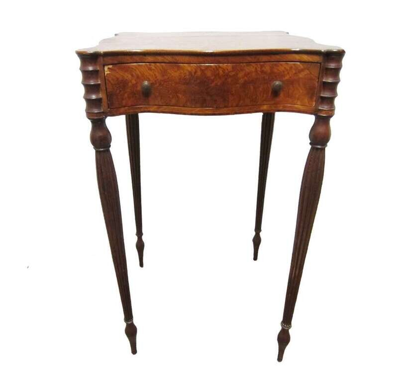 Serpentine top with outset corners on conforming frieze, fitted with drawer, on vase and tapering reeded legs on elongated bulb feet.