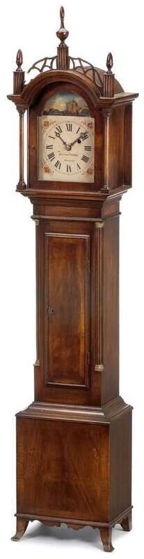 Three turned finials with fret carving below, arched face door, rocking ship movement, painted face signed, "Joshua Wilder, Hingham," black Roman numeral chapter ring, rectangular molded edge waist door flanked by quarter round fluted corners, plain base on French bracket feet, 30 hour movement.