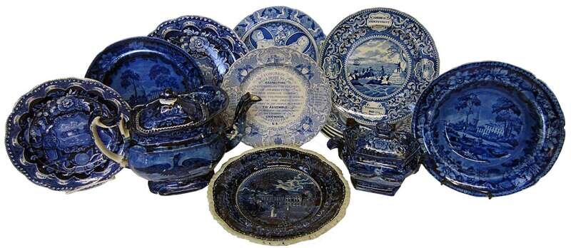 Including plate with molded border, "Capitol Washington," teapot in "Boston Harbor," two "States" plates, a sugar bowl decorated with eagle bearing banner with stars, "American Villa" soup plate and plate, five "Landing of the Father's at Plymouth," one "Abolition" plate and a plate decorated with portrait medallions, including Washington and Franklin.