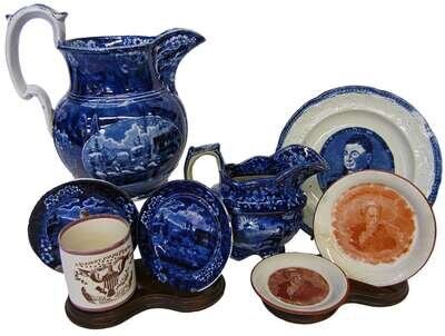 Including a molded Historical Blue pitcher printed in "Landing of Lafayette in New York 16 Aug 1824," two cup plates in the same pattern, a Lafayette portrait plate with molded border and a "Lafayette at the Tomb of Franklin" creamer; together with two sepia printed Andrew Jackson, "Hero of New Orleans" small plates and a pink lustre and brown printed child's mug, "A Present for My Dear Boy-Success Attend our Agriculture Trades and Manufactures."