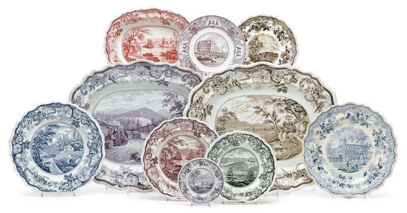 Variously sized and colored plates printed with Hudson River scenes including "Fort Edward," view of "Baker's Falls," "Fort Miller," "West Point," and "Sandy Hill"; together with an Adams small plate and a Mellor Venables dinner plate with "View from Ruggles House, Newburgh."