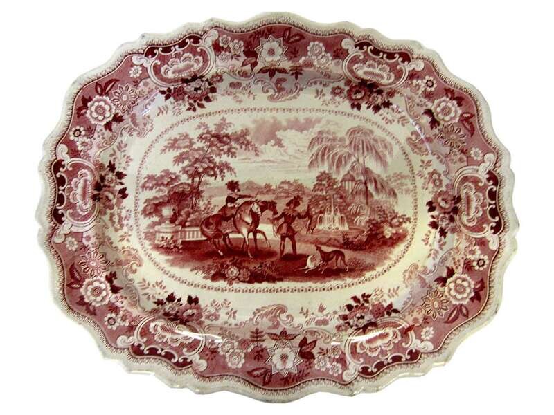 Including a red-printed platter in "Andalusia" pattern, a purple platter in "Cologne" pattern, a plate in "Asia Display'd," a light blue printed partial child's tea set with five teabowls, five saucers and six plates in Gothic pattern; together with a Leedsware covered tureen, and two molded and polychrome printed plates, one depicting a velocipede.
