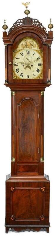 Federal inlaid mahogany tall case clock roxbury school, ma, circa 1800