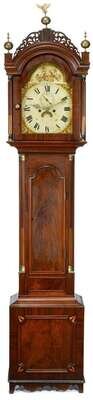 Arched molded cresting surmounted by pierced fretwork and three brass ball and spire finials, the center with an eagle, arched face door flanked by two fluted inlaid columns with brass stops, arched painted metal face in cream enamel with cornucopia in arch and floral corners, Roman numeral chapter ring, center subsidiary seconds dial above the post and date crescent below, waist door with arched molded edge flanked by quarter round inlaid and brass stop fluted corners, a small recessed panel below, base with applied square molded panel and dart inlays at corners, on straight bracket feet.