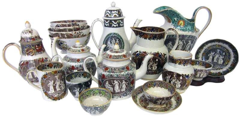 Staffordshire pearlware "Salopian" polychrome and transfer-printed items first half 19th century
