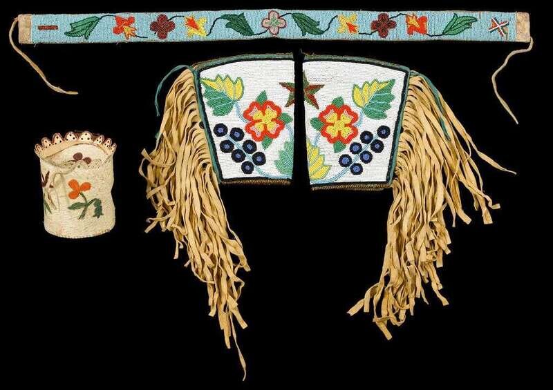 Plateau beaded belt, pair of gauntlets, and a painted parfleche box early 20th century