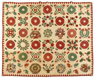Border of red triangles enclosing squares of floral and leafy wreaths and flower baskets worked with printed red, green and printed chintz pieces, many squares inscribed with signatures and verses, including: Sarah A.P. Frazier of Deer Creek, Harriet Wills, Rosa Neilson, Caroline K. Hall, Frannie Wilmot of Baltimore, Eliz.C. Chew and others, heightened with conforming and diamond quilting.