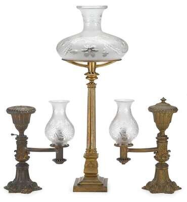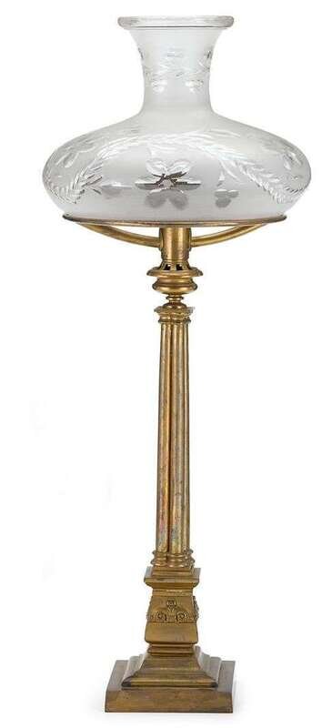 Gilt brass sinumbra lamp with cut glass shade messenger & son, london and birmingham, manufactured for jones, low & hall, boston