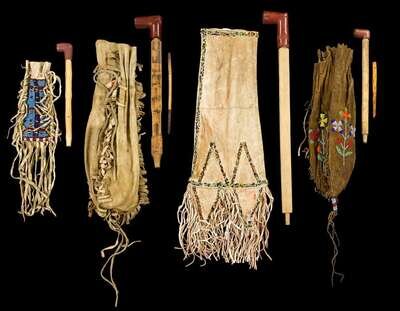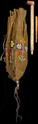 Beaded and fringed hide pipe bag and pipe belonging to Blue Thunder, survivor of The Battle of the Little Bighorn last half 19th century
