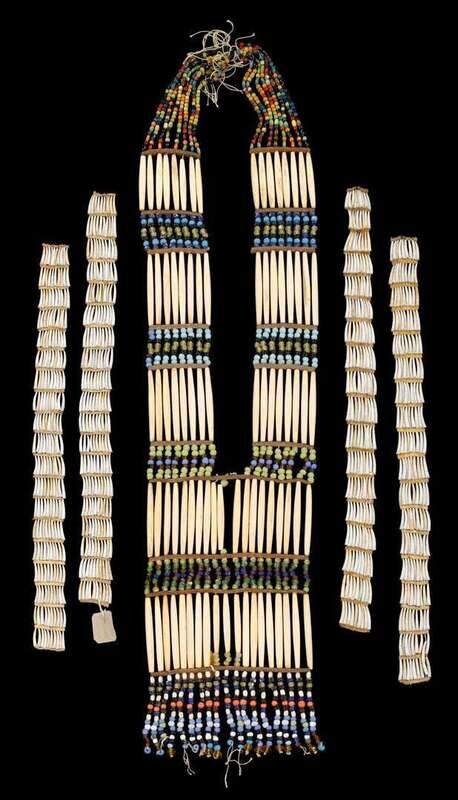 Sioux women's ceremonial hair pipe bone breastplate and dentalium shell ear pendants fort yates, north dakota, mid 20th century