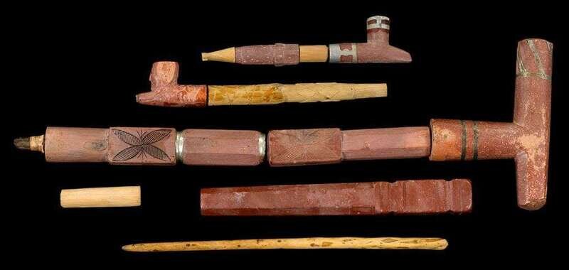 The first, a small pipe carved in the shape of a woman's head with carved horse and buffalo on sides with carved pipestem; the second, a small lead inlaid pipe with shaped Catlinite stem; the third, a large pipe inlaid with lead banding and two part pipestem, each incised with four petal motif; and a straight pipe of squared and incised end and octagonal shaft and tamper.