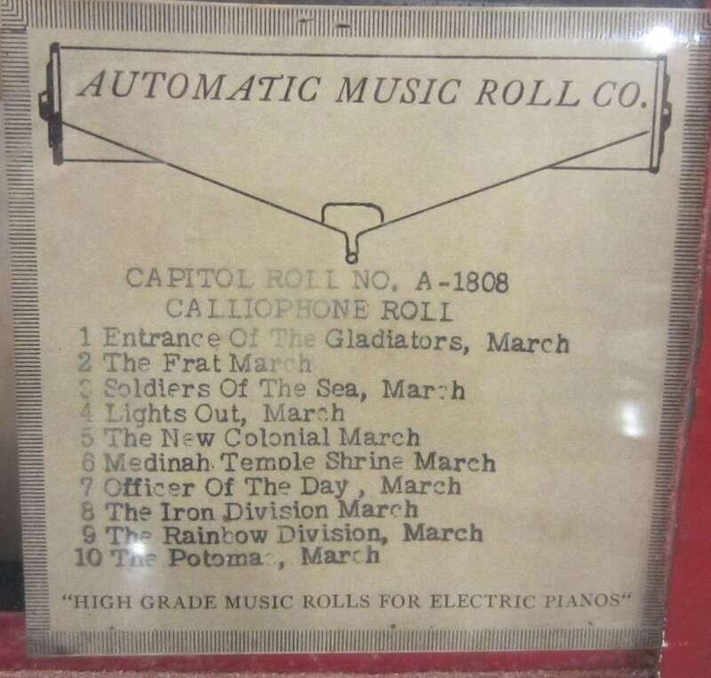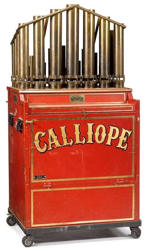 Model CA-43L, the set of forty-one brass pipes issuing from red metal cabinet with gilt lettering, "Calliaphone."
