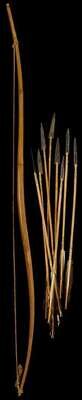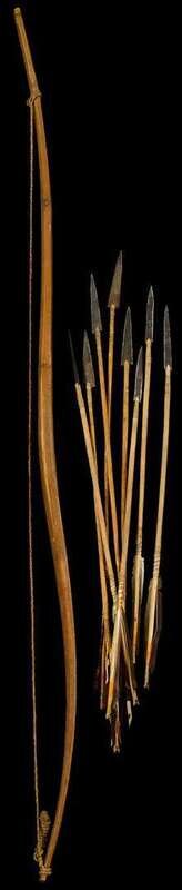The wooden bow with sinew string and eight sinew-wrapped arrows with metal tips.
