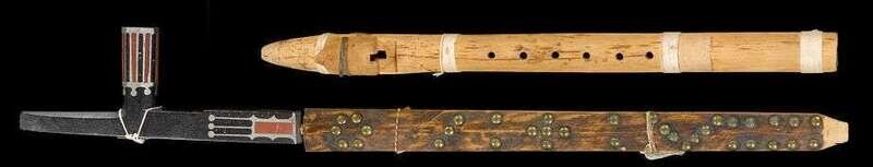 Inlaid Sioux black Catlinite pipe and carved wooden flute early 20th century