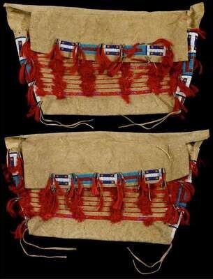 Flaps and sides decorated with geometric lane-stitched beaded banding in blues, red, white and yellow and tin cones with dyed red horsehair fringe, the front decorated with horizontal red quillwork and red feathers.