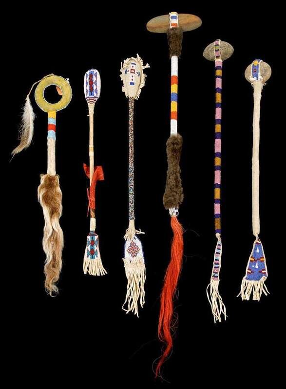Including three clubs with stone heads, two with beaded hide strap and shafts, one with beaded fringe dangler and the other with a fur and horsehair dangler; the third with a hide handle; two drum beaters with beaded hide heads, one with beaded handle and both with fringed and beaded ends; and a yellow dyed hide and beaded head on beaded handle with bell and deer hide ends.