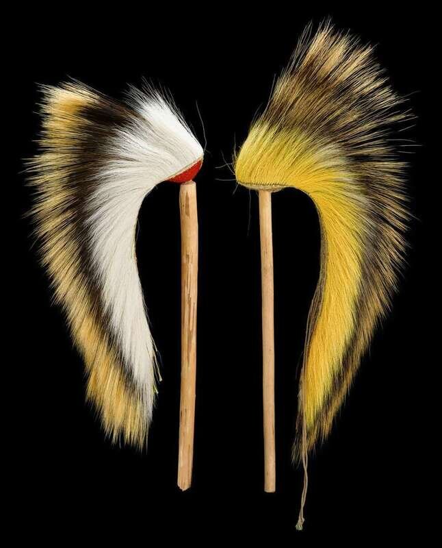 One with red yarn base, the other with hair base, each has storage stick; together with a bone roach center piece.