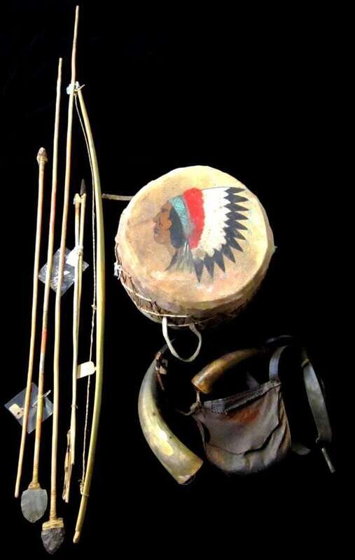 Including a ceremonial drum painted with Indian on one side and teepee on the other; a yellow and green painted bow strung with sinew; and three painted stone pointed lances with two stone pointed arrows, a powder horn, and a leather pouch with powder horn.