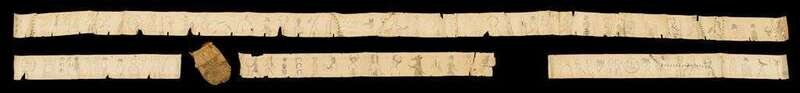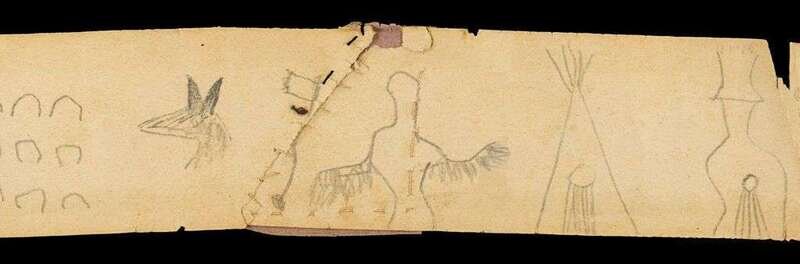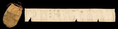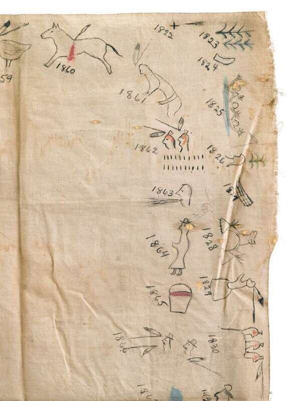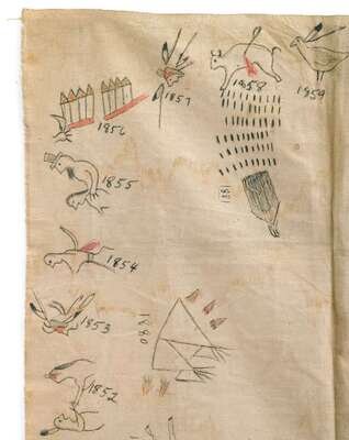 Ink and watercolor on muslin, hand-drawn pictographs and dates from 1822 to 1881; together with a paper roll with pencil-drawn pictographs, roll stored in small tobacco pouch, now in four sections.