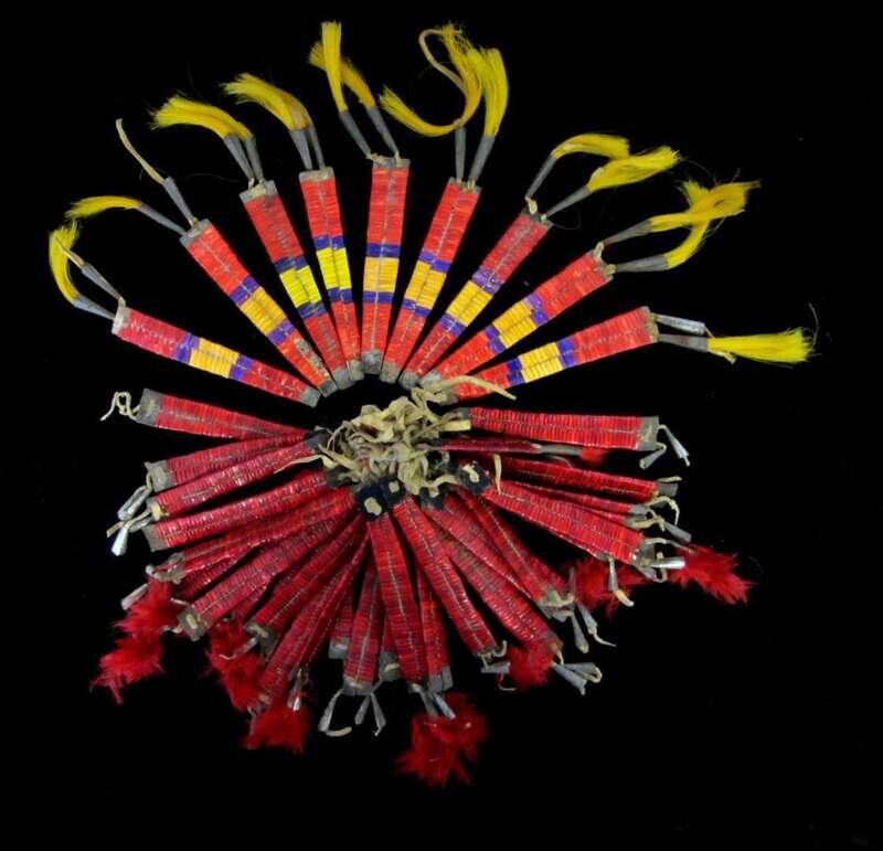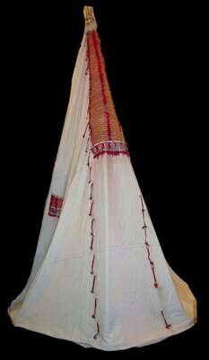 Canvas teepee and group of quilled hide teepee decorations first half 19th century