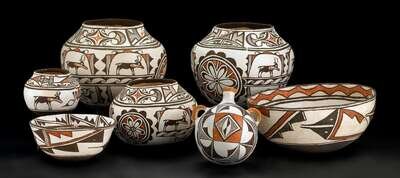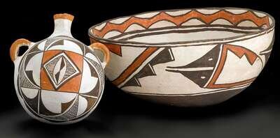 Large Zuni polychrome pottery bowl and a canteen zuni, new mexico, circa 1950