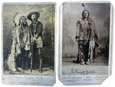 Each standing portrait mounted to photographer's card, the first with rounded corners and titled, "Sitting Bull" and the second titled in pencil by a contemporary hand, "Chief Gaul and Buffalo Bill."