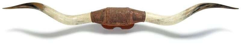 The horns centered by leather worked with the initials "JHK," silhouette of Texas, and Longhorn steer.