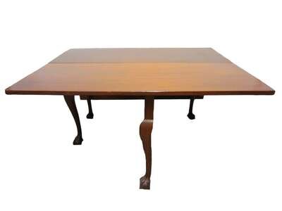 Rectangular top with deep conforming leaves on an arched apron and cabriole legs ending in ball and claw feet.