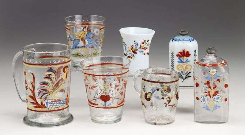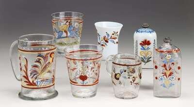 Including an enamel-decorated large and small mug, three tumblers, two bottles, a small etched flip glass and etched mug, an amber colored flip glass and an aqua flask with sheaf of wheat on one side and tree on the other; together with a group of eight lacy pressed uncolored glass cup plates, patterned with eagles, Bunker Hill Monument, ship, side wheeler, the ship Benjamin Franklin and "Maj. Gen. Harrison."