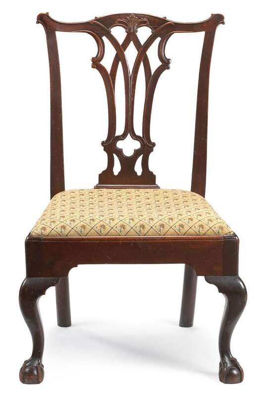 Serpentine crestrail with central leaf carving, molded edge ears, gothic pierced splat, trapezoidal slip seat, on cabriole legs with claw and ball feet.