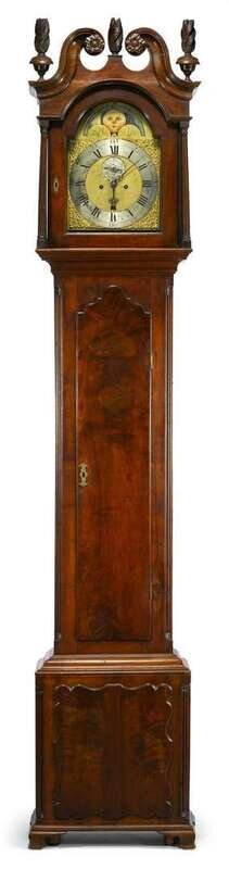 Double scroll molded cresting with floral carved rosettes and three inverted urn and flame finials, arched face door with front and back slightly tapering fluted round collumnettes, brass and steel moon faced face with continuous shell engraving over the moon phase dial and two half round shell engraved panels below, twin moon, ship and sea painted dial, steel black enamel Roman numeral chapter ring with outer minute ring, center with Arabic numeral subsidiary seconds ring and "Willm Huston, Philadelphia," lip molded waist door with arched serpentine top, quarter round fluted coners on waist and base, base with raised lip molded edge square serpentine panel on ogival bracket feet, brass plaque affixed to side of case.