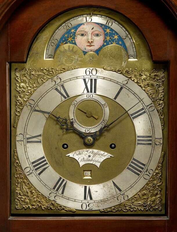 Double scroll molded cresting with floral rosettes and center flame carved finial, two applied branch decorations above and arched face door flanked by slender fluted columns, brass face with leaf spandrels, moon phased, silvered dial with Roman numerals and outer arabic numeral minute band, subsidiary seconds dial with Arabic numerals, silvered boss below post "Edw Duffield, Philadelphia" and day window below, arched lip molded waist door flanked by quarter round corner columns, base with applied rectangular sepentine lip molded panel flanked by quarter round corner columns on ogival bracket feet.