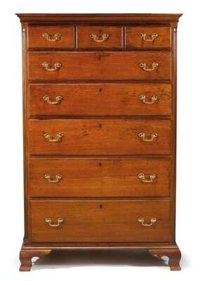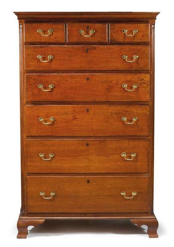 The corniced rectangular top above conforming case with three short drawers over five long graduated drawers, the whole resting on a molded base with ogee bracket feet.