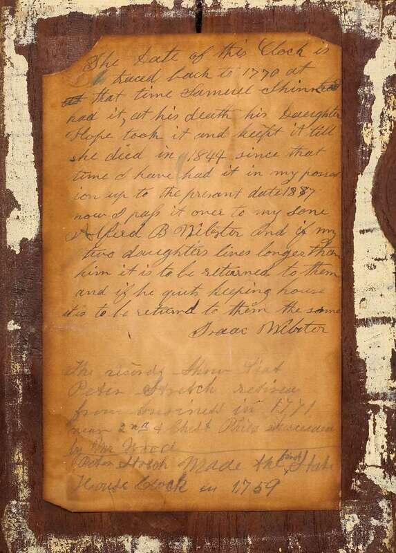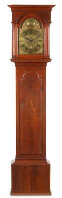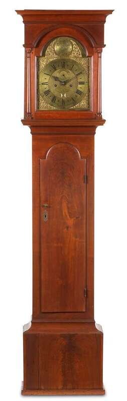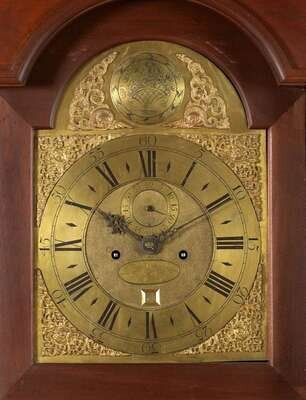 The hood with flat cove molded cresting above arched face door with three-quarter round columnettes, the arched brass dial face with hemispherical panel engraved with unique basket of fruit and flowers flanked by scroll and dolphin spandrels, circular Black Roman numeral chapter ring with outer seconds band, subsidiary Arabic numeral seconds ring above post, oval brass boss inscribed, "Peter Stretch" below the post, four ornate brass spandrels about the face, arched lip molded waist door, plain base, flush.