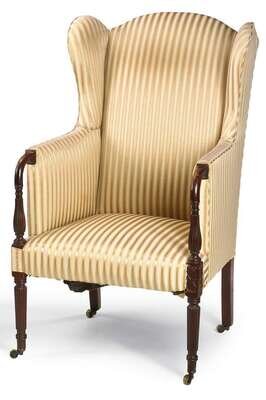 Arched back above curved wings and turned arms on reeded vase supports continuing to carved block and ring- turned tapering reeded legs on casters.