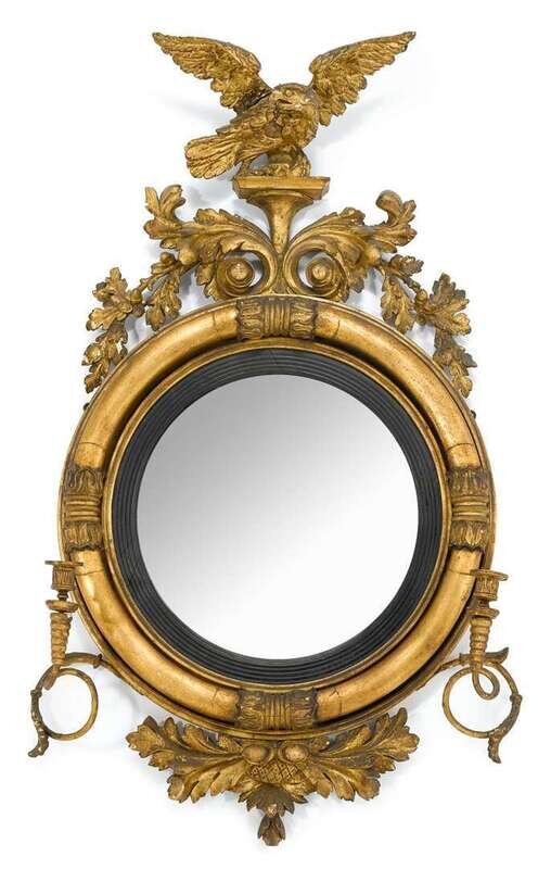 Eagle with outstretched wings above scrolled leafage and carved and molded frame, leafage and fruit below, scrolled metal candlearms.