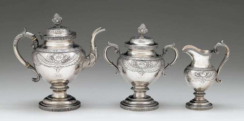 The corresponding teapot and covered sugar, each of urn shape with die-rolled rims, the upper body with repoussé roses centering a swag of leaves against a stippled ground, the domed lid with conforming decoration and bud and blossom finial, all raised on a stepped pedestal foot, the covered sugar seemingly unmarked; together with a related creamer by W. Gale & Son (1853-1866), New York, all monogrammed.