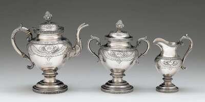 Assembled three piece repoussé partial tea service taylor & lawrie (1837-1857), philadelphia, pa, retailed m.w. galt & bro. (1847-1879)