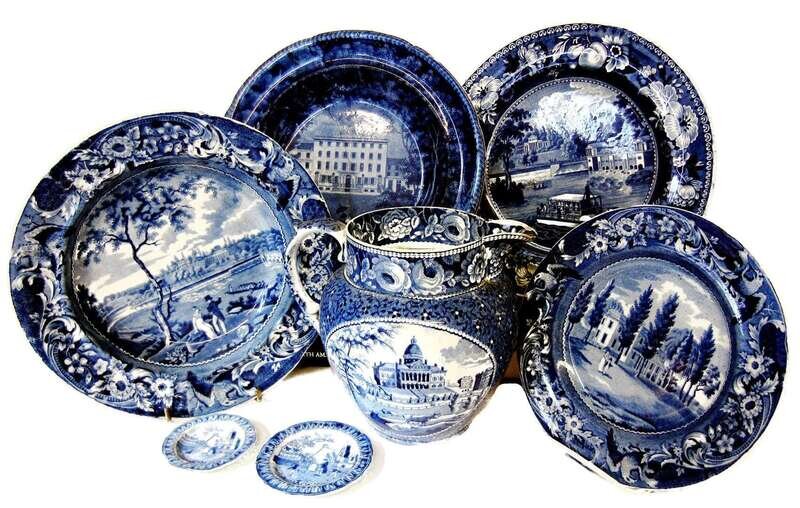 Including two "Franklin Flying a Kite" children's plates; "The Dam and Waterworks, Philadelphia" plate; "Fair Mount near Philadelphia" soup plate; "United States Hotel" soup plate; together with a "Boston State House" pitcher and a "Hoboken in New Jersey" small plate.