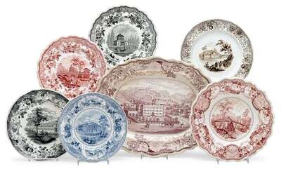 Including platter in "Penitentiary in Allegheny near Pittsburgh"; two plates and soup plate in "The Waterworks"; four plates in "The Race Street Bridge"; two "Dumb Asylum" plates; plate in "Headwaters of the Juaniata"; plate in "Schuylkill Waterworks"; and a plate in "Fairmount Waterworks."