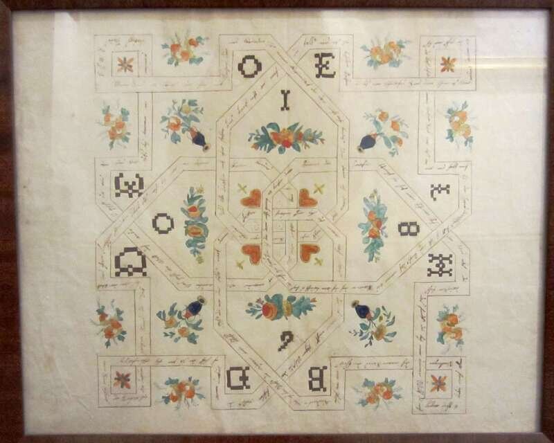 Watercolor and ink on paper, floral sprays, flowers in urns and hearts embellish the intertwined verse, framed.