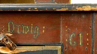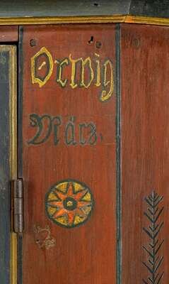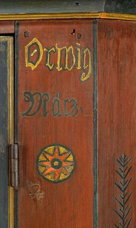 Molded cornice above single glazed door on base with single drawer and two raised panel doors on bracket base, painted red, green and yellow and decorated with flowerheads, sprigs and tulips.