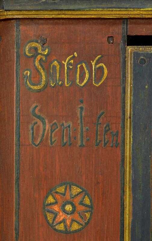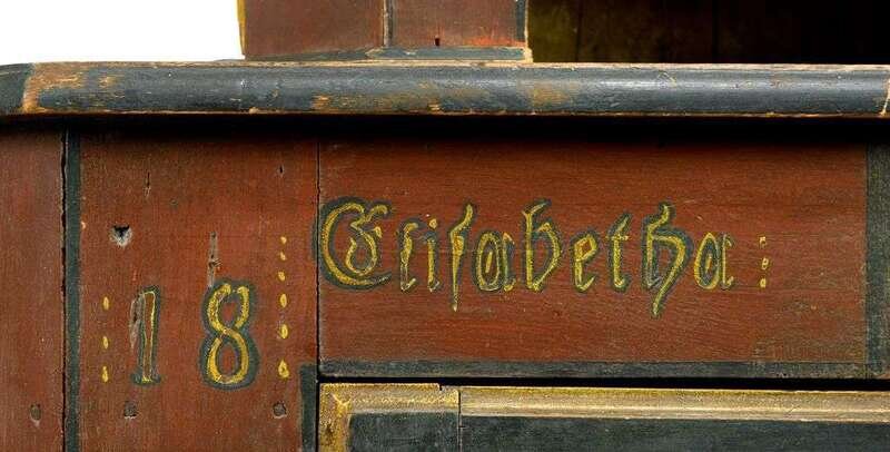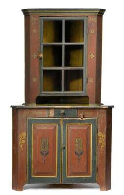 Rare diminutive painted and decorated stepback corner cupboard inscribed "jacob orwig" and "elizabeth orwig" and dated "1861," possibly york county