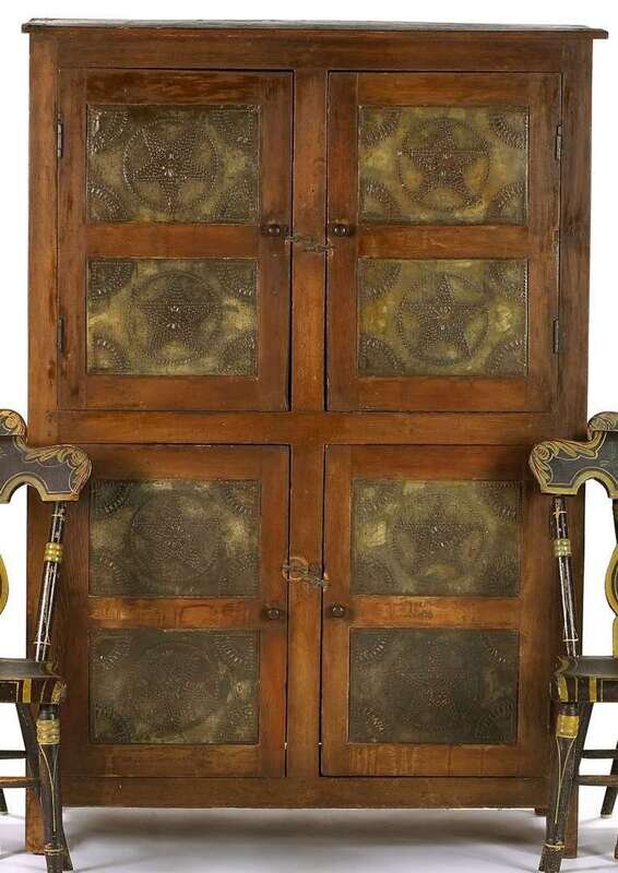 Rectangular top above four doors with tin panels pierced with stars and quarter fans at spandrels, recessed panel sides, straight feet.