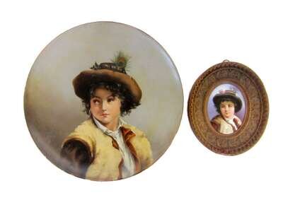 Depicting a portrait of a young boy wearing hat with peacock feather, the verso impressed, "Galloway and Graff, Philadelphia"; together with a framed miniature portrait on porcelain depicting related subject.